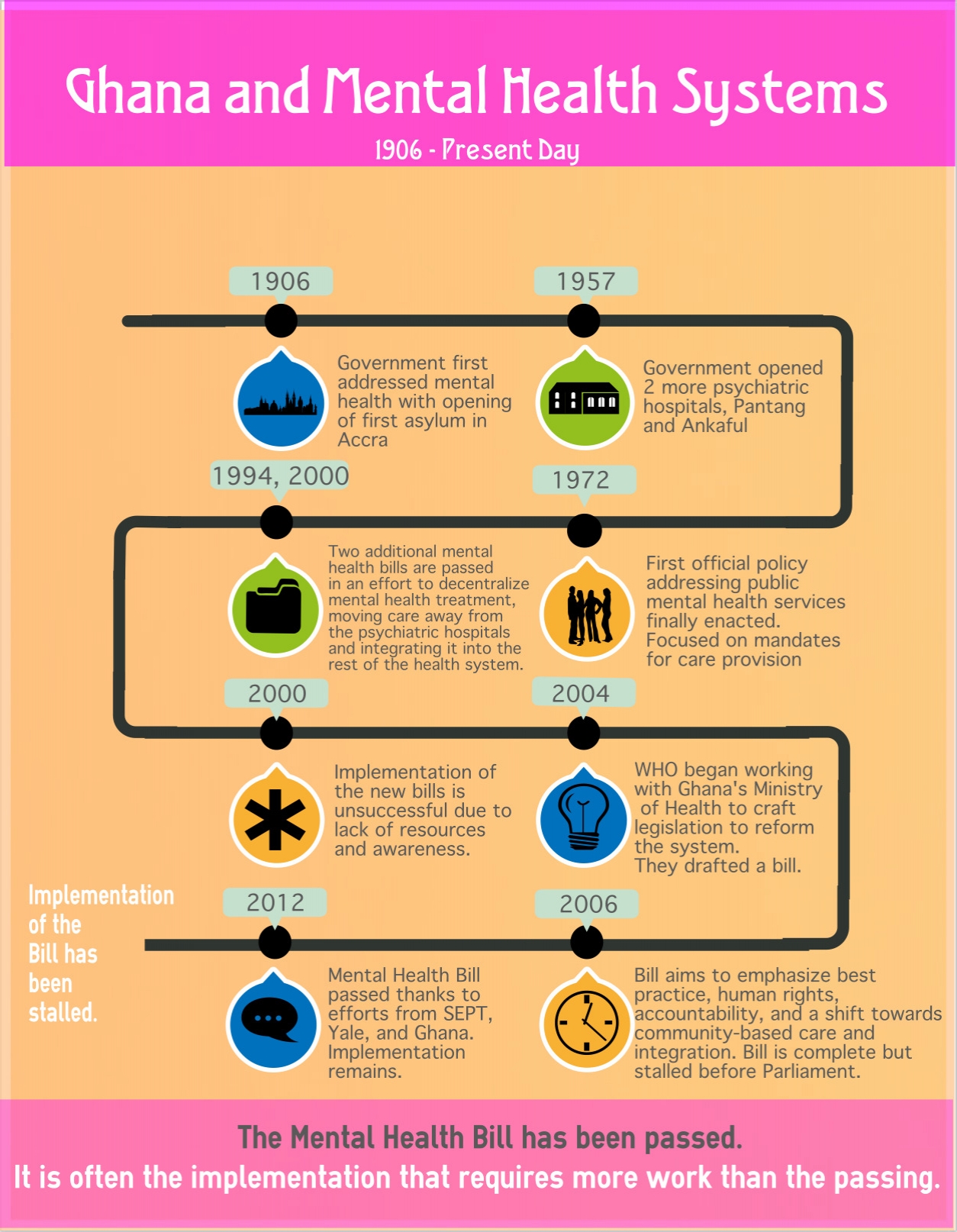 Although passage of the 2012 Ghana Mental Health Bill was a major milestone, it did not expand and enhance the workforce enough to implement the provisions set forth within and improve upon current mental health services. The bill also relies on a substantial amount of additional funding and administrative action, which has not been forthcoming.