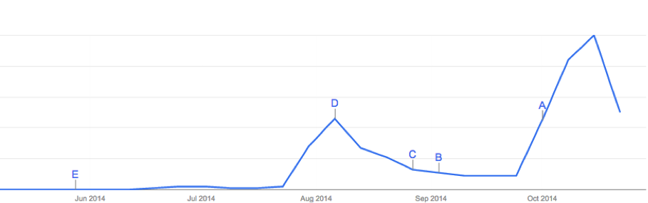 The severe reality of circumstances caused by the epidemic was not reflected in the international interest in Ebola. The international interest in Ebola is shown in the graph below, plotting the frequency of worldwide Google searches for the term “Ebola.” During the months of May, June, and July, worldwide interest in Ebola remained minimal. Point D, the first uptick in international interest, is on August 1, 2014, the day that WHO declared Ebola an international emergency. Interest peaks shortly after Point A on September 30, 2014, when the first case of Ebola was diagnosed in the United States.