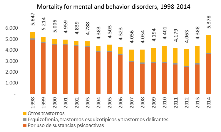 Statistics from the National Institute of Statistics and Geography (INEGI) showed that the number of deaths due to mental and behavioral disorders decreased by 29% between 1998 and 2008, but then increased by 33% between 2008 and 2014. During this latter period, there was a decrease in mortality associated with these disorders among individuals between 0 and 29 years old and an increase in mortality among 50 to 54 year olds. Additionally, the mortality associated with mental health disorders increased during the same period for both men and women, at 17% and 18% respectively.29 The global financial crisis of 2008 and the Mexican government’s war against drugs, which started in 2006, may have created an atmosphere of social unrest that led to these trends.