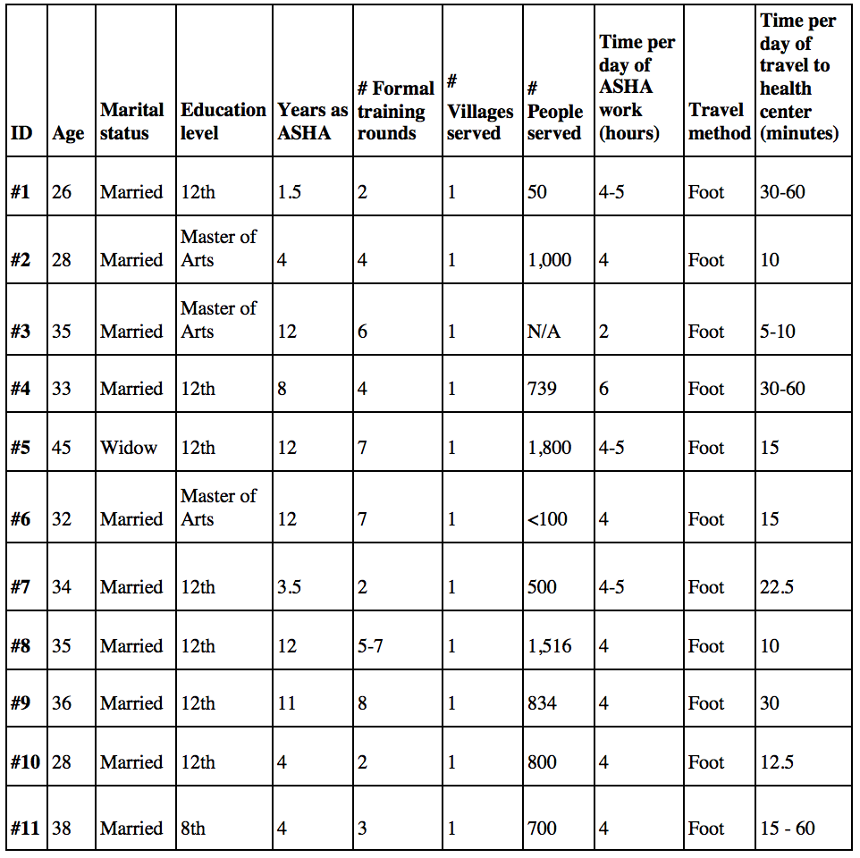Thank you to Farhana Jamal and Pawan Singh Bhadauriya for their consideration of the ASHA. Thanks also go to the ASHAs who gave their valuable time for interviews. The Yale Global Health Field Experience & Seed Funding Awards funded this research.